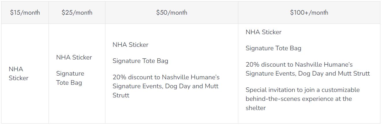 That's where you come in. As a monthly donor, you can take pride in knowing that you are sustaining the life-saving work of Nashville Humane Association. Your donation goes further since administrative costs are minimized. And, you get some pretty sweet benefits: